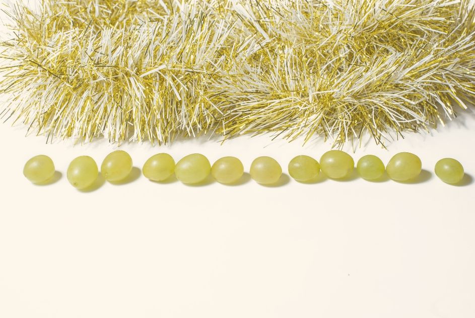 Spaniards traditionally start the New Year by eating 12 grapes at midnight—one grape during each stroke of the clock, representing the 12 months of the coming year. Sweet grapes predict good months, while sour predict bad ones. Not finishing all 12 grapes by the last stroke means bad luck.